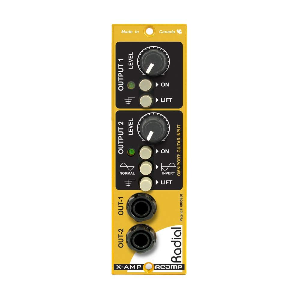 X-Amp 500 Reamp. "The Radial X-Amp 500 Reamp is one of the eight modules designed to be comprise the Radial Workhorse Rack and Mixer System that combines the popular 500 series platform with an incredibly flexible patching system to let you create the ultimate studio environment. The Radial X-Amp is a 500 series module that lets you take a pre-recorded guitar track and send it back to amplifiers and effects so that you can tailor the sound to suit. The advantages of Reamping are many: when recording, the guitarist need only concentrate on the performance. Working out specific sounds and optimal mic placement can be done later. This eliminates hours of tiresome repetition while allowing the producer to adjust the character of the track as the production evolves.Using the X-Amp is 'plug and play' easy to use. The design begins with an XLR balanced line level input located on the 500 series rear panel that feeds the X-Amp. To ensure the very highest fidelity, 100% discrete class-A circuitry is employed. The X-Amp unbalances and buffers the pre-recorded signal where it then feeds two transformer isolated hi-Z guitar level outputs. The A1/4"" jacks are front mounted for desk-top convenience and equipped with ground lifts to help eliminate hum and buzz caused by ground loops. Independent level controls enable you to adjust the drive going to each amp for optimal tone. Should one of the amps be out of phase, depressing the 180 quickly brings both in line. The X-Amp Reamper works with guitars, basses, keyboards and even voice! You can send the signal through guitar effects pedals too. In fact the only thing holding you back is your imagination."